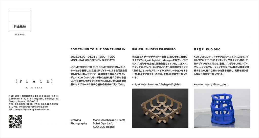 SHIGEKI FUJISHIRO / KUO DUO 「SOMETHING TO PUT SOMETHING IN」 #exhibition#exhibition#shigekifujishiro#kuoduo#(place)bymethod#2023 Photo : KUO DUO SHIGEKI FUJISHIROhttp://shigekifujishiro.com/ KUO DUO https://kuo-duo.com/